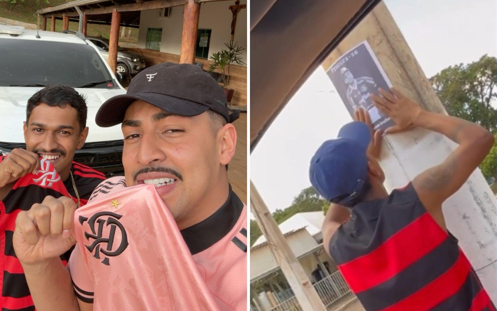 A gravação mostra os dois pregando os cartazes e divertindo os moradores da cidade